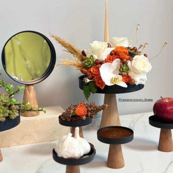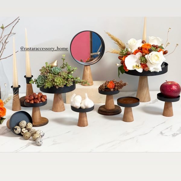 جنس پایه چوبی جنس سینی فلزی شامل ۱۰ تکه ۶ عدد کوچک و یک عدد بزرگ دو شمعدان و یک